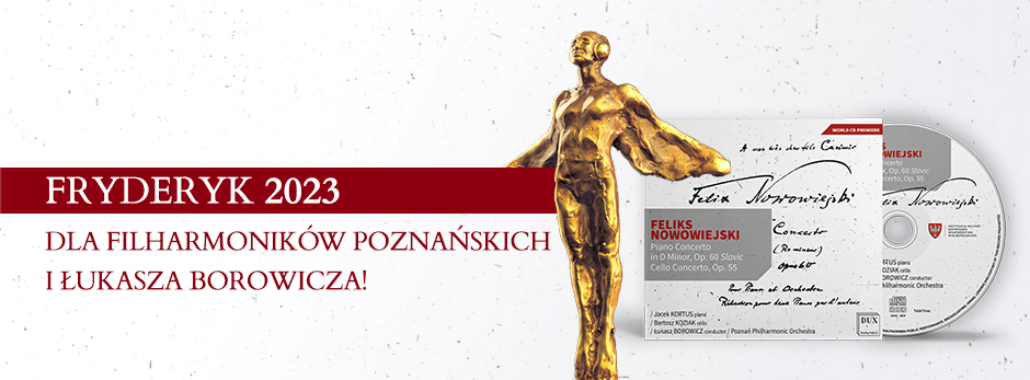 Płyta z dwoma koncertami Feliksa Nowowiejskiego – fortepianowym c-moll op. 60 (zwanym Słowiańskim) i wiolonczelowym op. 55, nagrane przez Filharmoników Poznańskich oraz pianistę Jacka Kortusa i wiolonczelistę Bartosza Koziaka pod batutą Łukasza Borowicza, otrzymała nagrodę Fryderyk 2023! W kategorii Album roku – muzyka koncertująca.