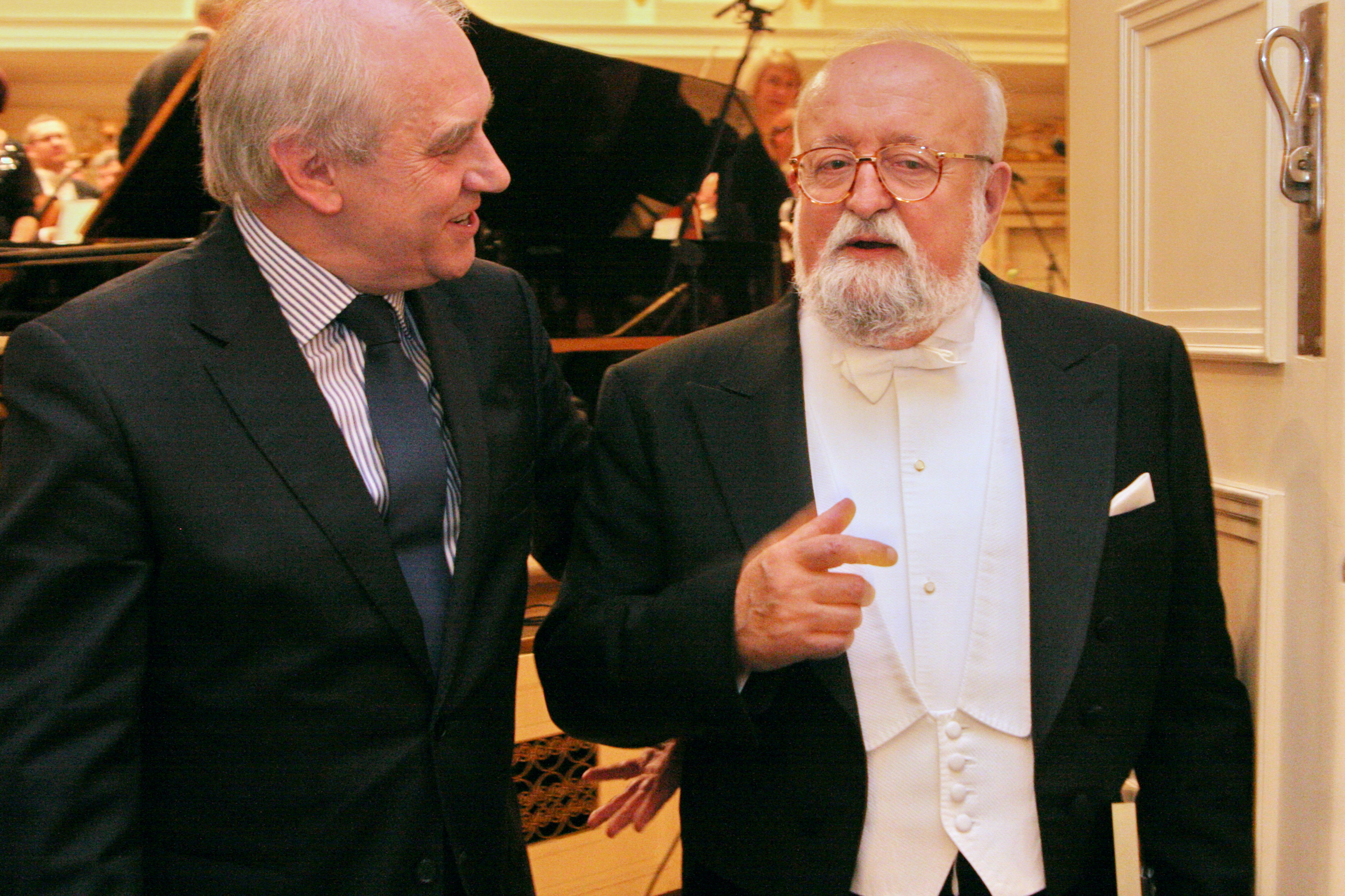 When I took over the Poznan Philharmonic I knew, that I should invite here the most prominent Polish composers. I didn’t manage to invite Henryk Mikołaj Górecki and Wojciech Kilar due to their health conditions, in spite of very nice conversations and great kindness from their side. While Krzysztof Penderecki had, like always, a tightly packed schedule. Knowing that in 2013 he would celebrate his 80th birthday and that he would be then sought-after not only in Poland, I figured we could suggest that he came a year before. Above all, his 79th birthday fell then (in 2012) on Friday, which is our habitual concert day. Maestro was so happy with his invitation to Poznań after many years that he suggested to perform with our philharmonic orchestra a Polish premiere of his recent symphonic piece – Double Concert for violin, viola and orchestra, which only a month ago had its world premiere in the Golden Hall of Musikverein in Vienna. In the capital of Austra Mariss Jansons conducted the work, while in AMU Concert Hall – the composers (in both performances Julian Rachlin, to whom the piece was dedicated, played the solo part on viola). In the second part of the concert held on the 23rd of November 2012 Krzysztof Penderecki led one of his favourite symphonies – No. 7 by Ludwig van Beethoven.