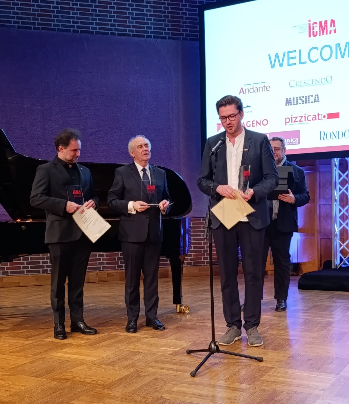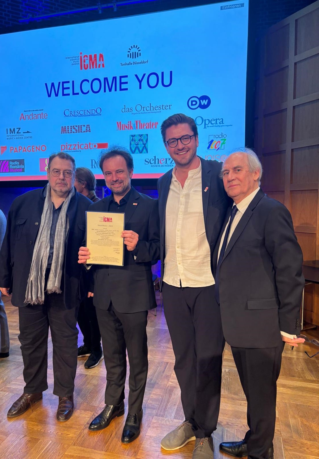 Zaskoczenia, ale i radości nie kryli odbierający ICMA 2025 za album „Urlicht. Songs of Death and Resurrection”: Wojciech Nentwig – dyrektor Filharmonii Poznańskiej, Łukasz Borowicz – dyrygent-szef Orkiestry Filharmonii Poznańskiej i dyrektor muzyczny Filharmonii Poznańskiej, Samuel Hasselhorn (baryton) oraz Jean-Marc Berns, przedstawiciel wytwórni Harmonia Mundi.