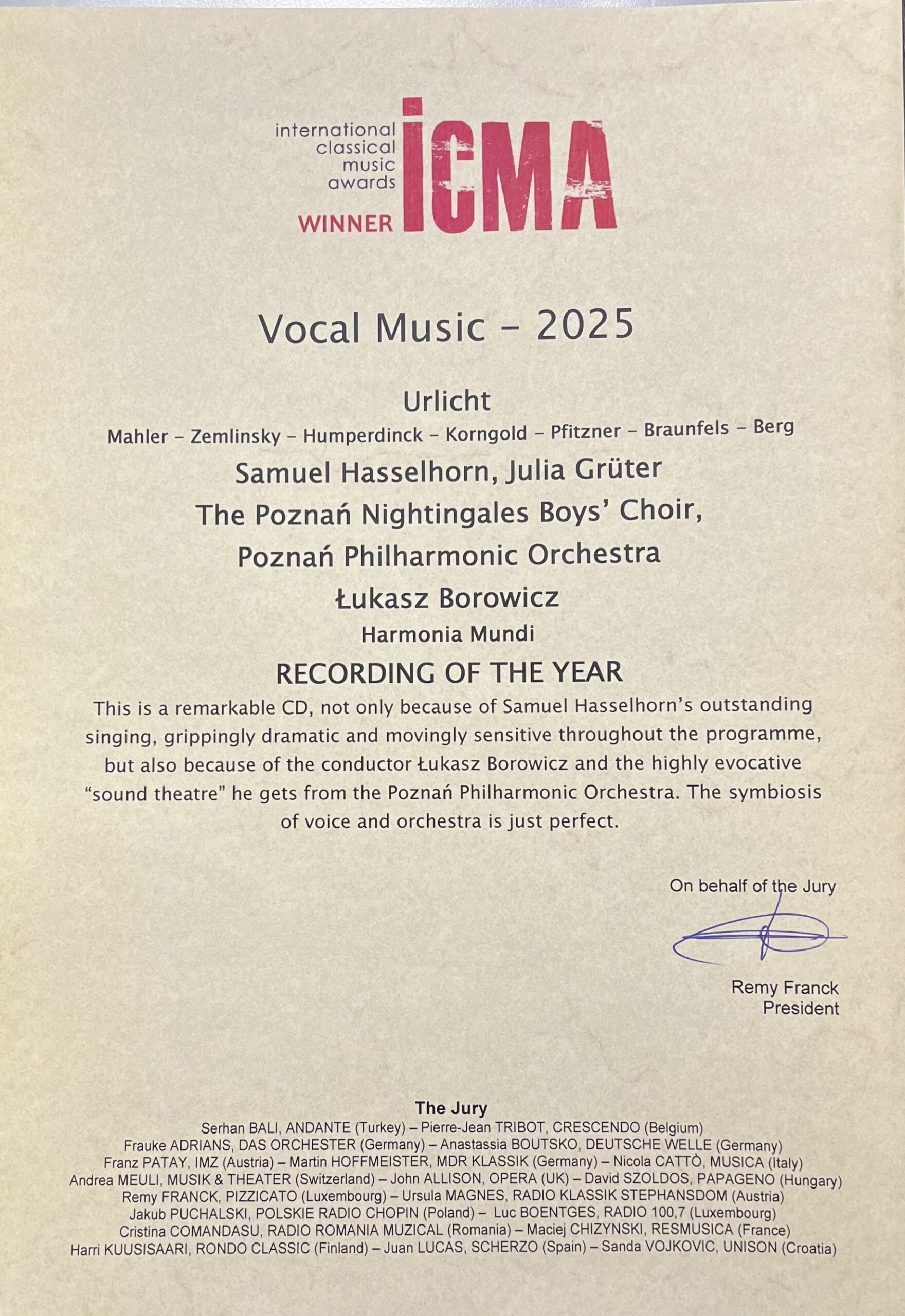Album „Urlicht”, na którym znalazły się pieśni i arie Gustava Mahlera, Ericha Wolfganga Korngolda, Alexandra von Zemlinsky’ego, Hansa Pfitznera, Engelberta Humperdincka, Albana Berga i Waltera Braunfelsa, ukazał się w ubiegłym roku nakładem wytwórni Harmonia Mundi. W uzasadnieniu jury ICMA napisano: To, co czyni ten album wybitnym, to nie tylko wyjątkowy śpiew Samuela Hasselhorna – już to porywająco dramatyczny, już to poruszająco wrażliwy – lecz również dyrygent Łukasz Borowicz i niezwykle sugestywny “dźwiękowy teatr”, jaki tworzy z Orkiestrą Filharmonii Poznańskiej. To zaiste doskonała symbioza głosu i orkiestry.