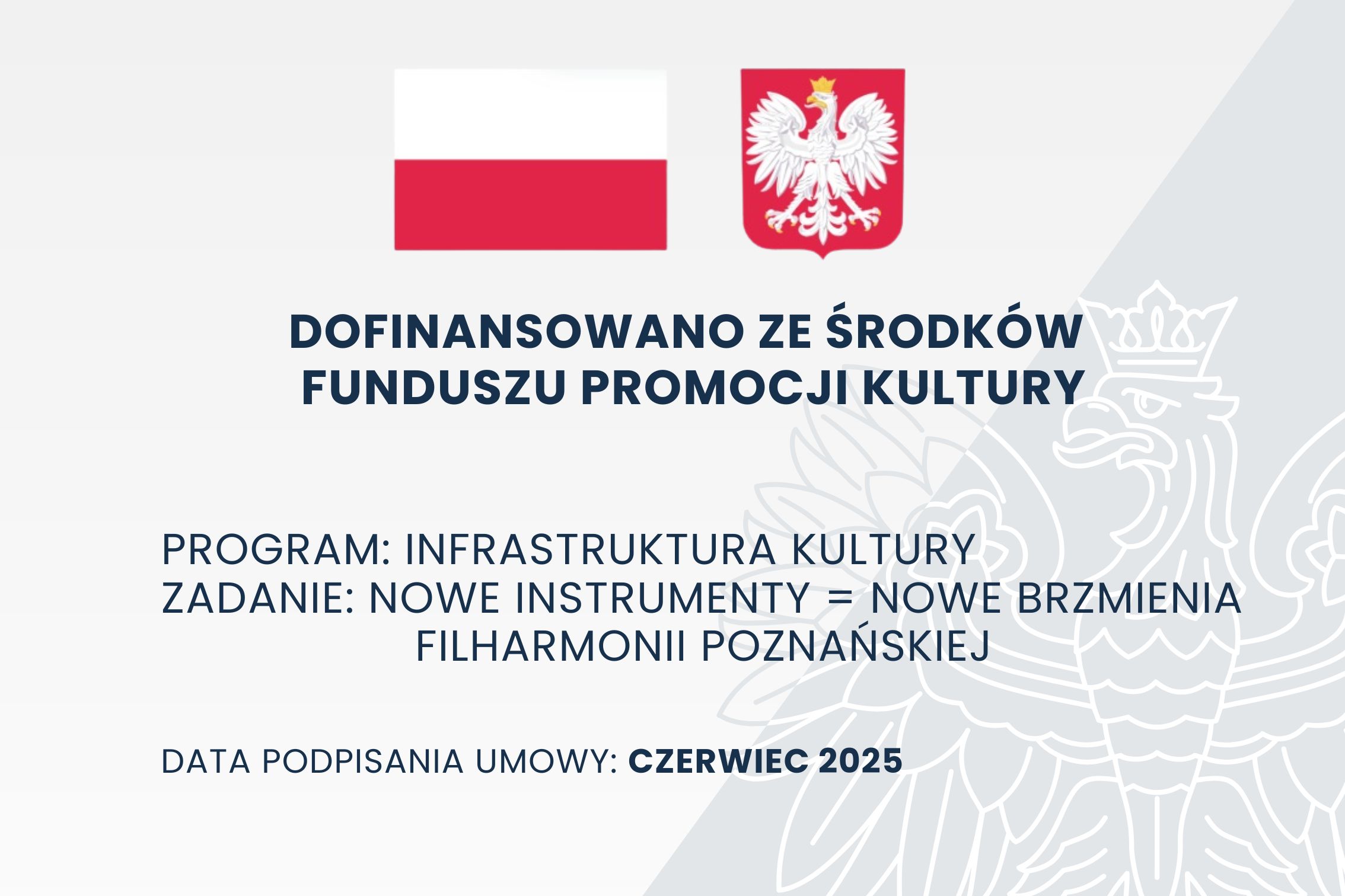 W ramach Programu Operacyjnego Ministra Kultury i Dziedzictwa Narodowego Infrastruktura Kultury Filharmonia Poznańska zakupiła Harfę koncertową marki “Lyon & Healy” wraz z akcesoriami: trzyczęściowym pokrowcem transportowym, futerałem transportowym na kółkach oraz wózkiem do harfy.